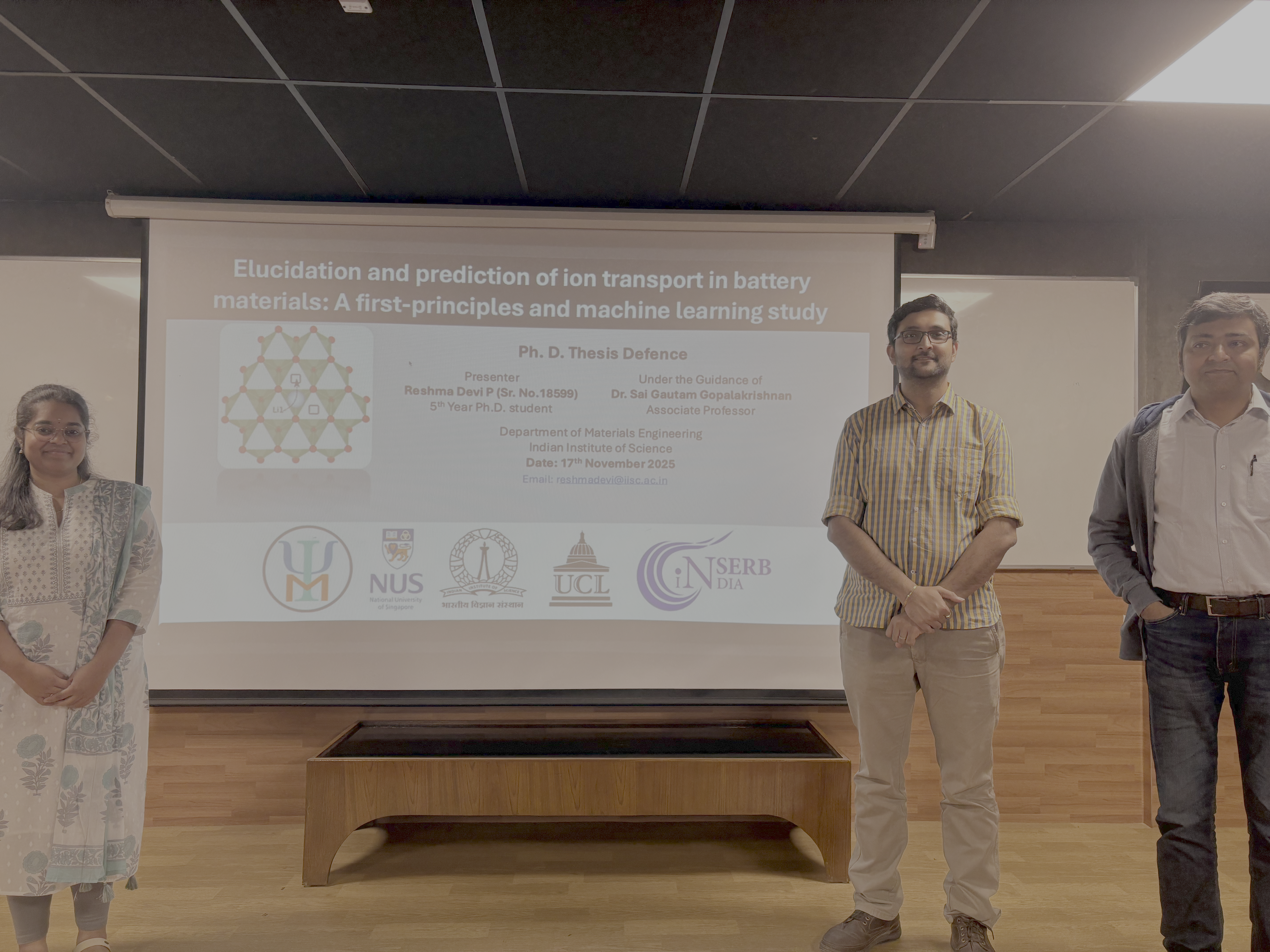 Reshma Devi successfully defended her PhD thesis in the Department of Materials Engineering, Indian Institute of Science on 17th December, 2025. The venue was the KP Abraham auditorium in the Department of Materials Engineering. Her thesis is titled, “Elucidation and prediction of ion transport in battery materials: A first-principles and machine learning study”. The group wishes her the best on her post-PhD career.