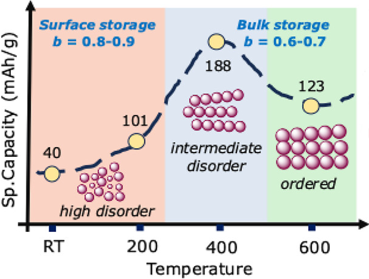 The inability of graphite to store Na+ ions at low potentials necessitates the use of disordered materials as anodes in Na-ion batteries, wherein complex degradative pathways limit cycle life. This study delineates the influence of synthetically induced material disorder in facilitating stable, high-rate sodium ion storage in a series of anatase titania analogs. The degree of disorder in the titanium oxyhydroxide (TiOx(OH)y-Tanneal) materials, synthesized via a simple, solution-phase sol–gel protocol employing a Ti(III) precursor, is systematically varied by tuning the postsynthesis annealing temperature (Tanneal). The variable disorder in TiOx(OH)y-Tanneal stems from the distribution of residual Ti(III), N-dopants, and O-vacancies in these materials as a function of Tanneal, as mapped by XPS, bulk-sensitive resonance inelastic X-ray scattering (RIXS), and EPR spectroscopy. In terms of electrochemical performance, we observe a unique, nonmonotonic dependence of Na+ storage capacity on the synthetically induced degree of disorder in TiOx(OH)y-Tanneal, instead of a simple inverse size dependence, as normally seen in the case of fully crystalline anatase materials. Further in contrast to crystalline anatase, the disorder in TiOx(OH)y-Tanneal opens up a bulk mode of Na+ storage instead of a purely surface confined or capacitive mode, as determined by scan rate-dependent cyclic voltammetry. TiOx(OH)y-400, with an intermediary amount of disorder in the prepared series of materials, shows the highest specific capacity (∼188 mAh/g) and cycling stability for Na+ storage at elevated rates. These results are in agreement with our first-principles simulated data exhibiting a higher number of possible sites that Na+ can occupy at an intermediate degree of disorder in a TiOx(OH)y structure.